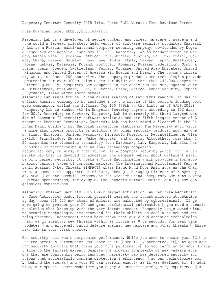 Vielen Dank dass Sie Kaspersky Internet Security herunterladen. Kaspersky Internet Security 2015. From the Kaspersky Internet Security 2015 Knowledge Base you will learn how to install activate and update the application and how to download virus removal utilities.