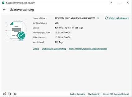 Im Fenster Lizenzverwaltung betaetigen Sie den Button Programm aktivieren. Kaspersky Internet Security delivers premium protection against viruses and web threats safeguards your privacy and defends against identity theft. Sie koennen einen Aktivierungscode fuer Ihr Kaspersky-Programm im Fenster Aktivierung eingeben.