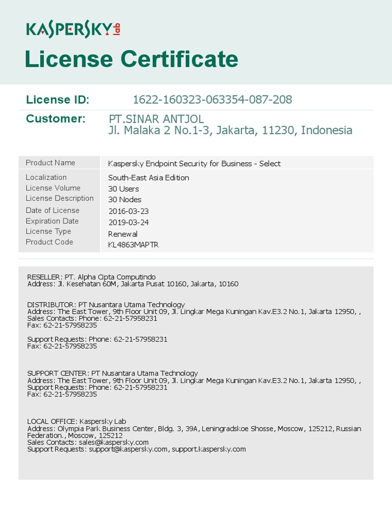 Kaspersky License Certificate