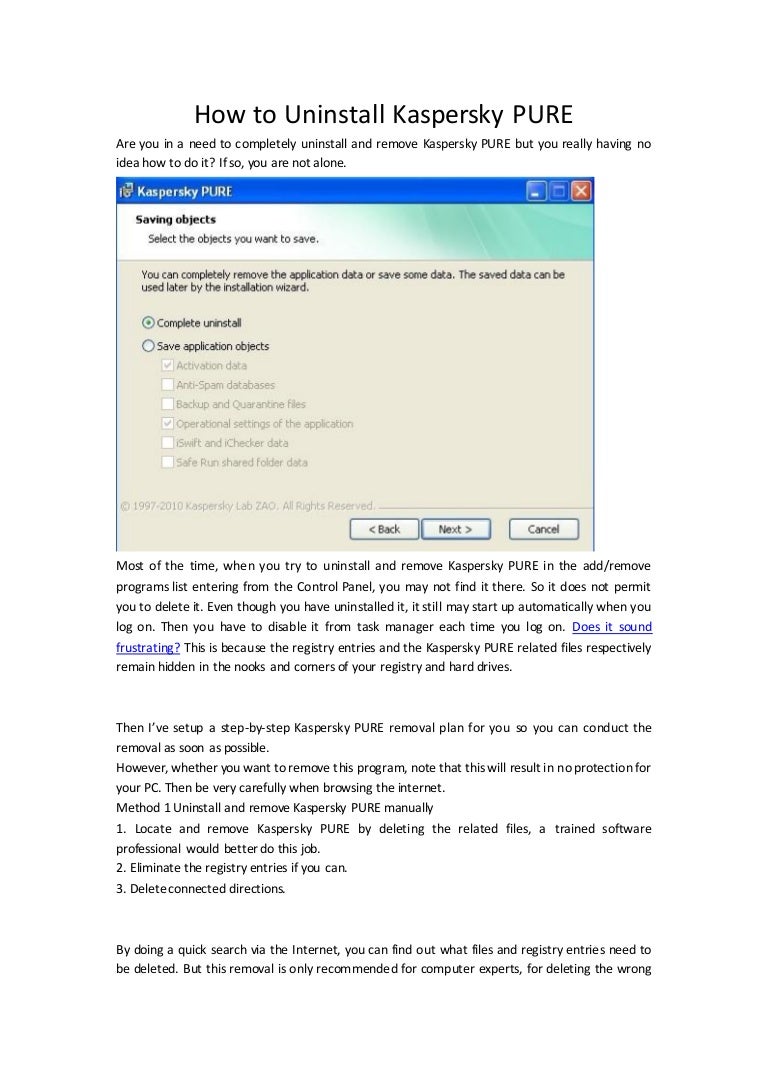 How to Uninstall Kaspersky PURE 30 Total SecurityUnable to remove the program. Soon you will see the End User License. Record Kaspersky Rescue Disk to your USB device using the utility.