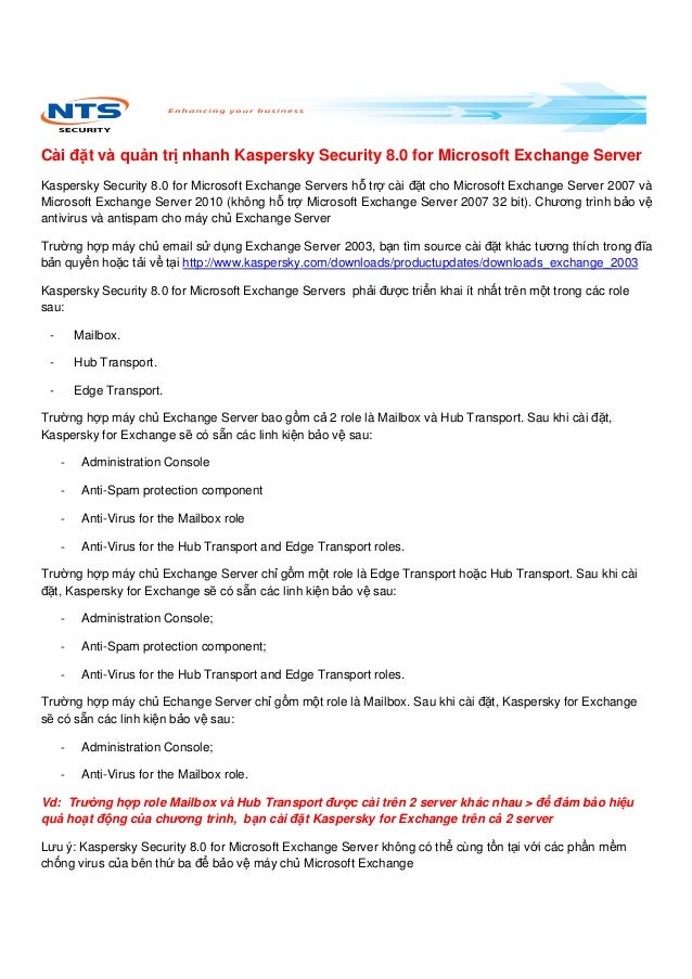 Kaspersky Security 80 for Microsoft Exchange Servers ensures world-class anti-malware and anti-spam protection of your Microsoft Exchange mail servers thanks to the new powerful antivirus engine comprehensive antivirus scanning of messages and intelligent spam detection. Knowledge Base for Kaspersky Security 90 for Microsoft Exchange Servers contains the information on how to install activate and update the product. Download the most up-to-date version of Kaspersky Security for Mail Server applications to get the latest technology and performance updates.