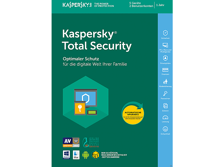 Das Premium-Sicherheitspaket bietet Ihnen und Ihrer Familie Schutz auf allen Geraeten. Kaspersky Total Security Code in a Box. Kaspersky Total Security 2021 1 eszkoez Multiplatform a Media Markt kategoriaban.